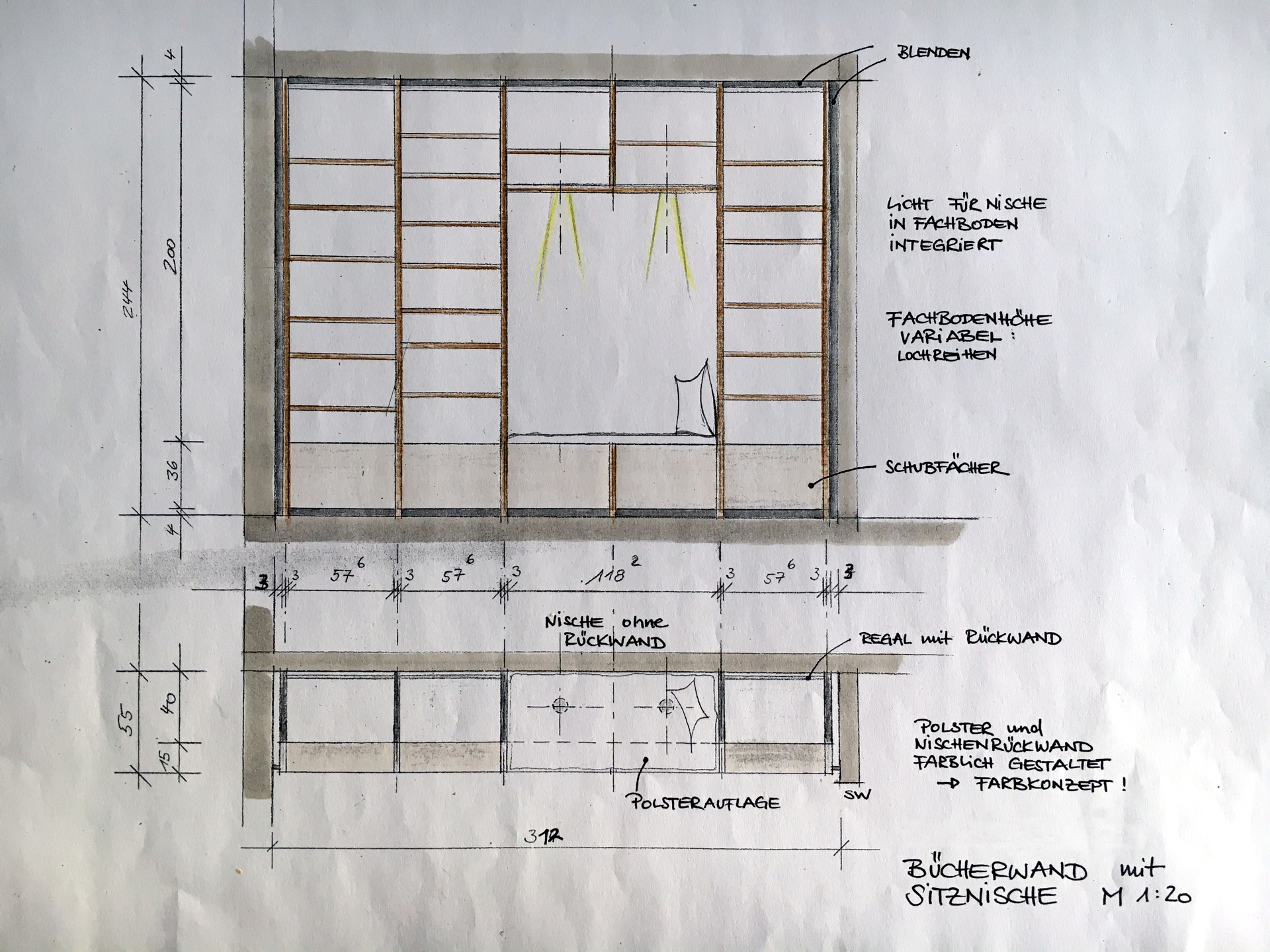 Die Kundin kontaktierte mich mit folgendem Anliegen: Sie wünschte sich Unterstützung für die Erarbeitung eines Gesamtkonzeptes für ihr Schlafzimmer, welches sich in einem baustellenähnlichen Zustand befand. An einem Termin vor Ort entstand im Dialog eine Skizze, in welcher vorhandene Möbel integriert und neue platziert wurden. Bei einem weiteren Termin bei mir im Büro, stellten wir gemeinsam die Materialien zusammen. Der Kalkputz und das geölte Parkett sorgen für ein gutes Raumklima. Die Pflanzenmotivtapete, zwischen der vorhandenen Holzdecke und dem neuen Holzbelag, bringen Geborgenheit und Wärme in den nach Norden orientierten Raum. Die hellblauen Lichtschalter und Steckdosen, aus dem „LeCorbusier“ Programm der Firma Jung, fügen sich in die Farbwelt der Tapete ein, ebenso der Farbton der neuen Vorhänge. |